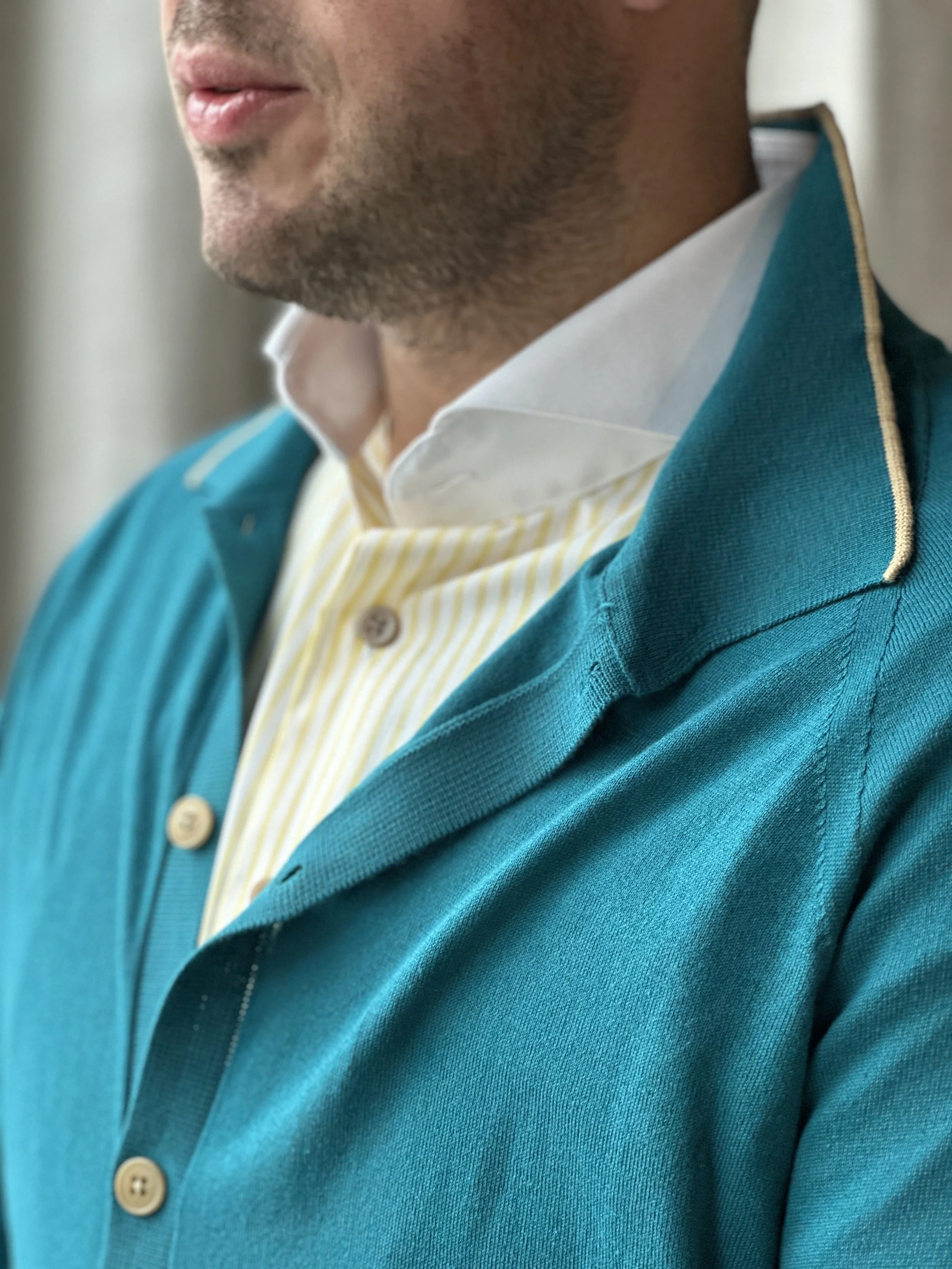 Een geel gestreept hemd met witte kraag zou al snel veel aandacht trekken onder een eerder klassieke kleur van cardigan. In dit beeld wordt deze minder uitgesproken door er een complementaire felle kleur van cardigan bij te combineren, waarbij er opnieuw een klein accent van zacht geel aanwezig is om de connectie tussen beiden te leggen en daardoor een evenwichtige balans te maken.